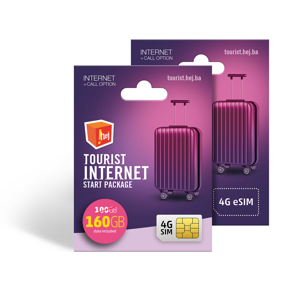 !hej Tourist+ package includes an initial credit of 1 KM on the main account and 100GB 160GB* of Internet data. Users of this package can activate data and voice options as defined in the Tourist tariff options price list, which are available for activation on the existing !hej Tourist package with a 20 GB bonus.