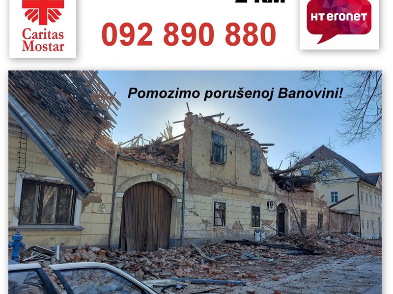 Caritas Mostar i HT Eronet uključili su se u prikupljanje pomoći za porušenu Banovinu. Pozivom na br.: 092 890 880 donirate 2 KM.