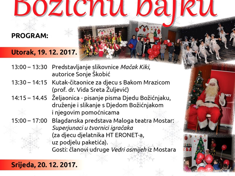 Predstava za djecu djelatnika HT ERONET-a uz podjelu paketića – Superjunaci u tvornici igračaka, u izvedbi Maloga teatra Mostar, na rasporedu je od 15 sati. Drugoga dana Božićne bajke, od 18 sati, ispred Kosače, prolaznike će prigodnim božićnim pjesmama zabavljati Ivo Jurić i Karlo Milićević, a za 19 sati planirana je Blagdanska plesna razglednica s Mostarskim mažoretkinjama u kojoj sudjeluju i PŠK Zrinjski, Plesni studio Mo Stars, PS FLASH Mostar, Plesni klub Erigo-D, Plesni centar ProDance, Plesni studio B-dance.