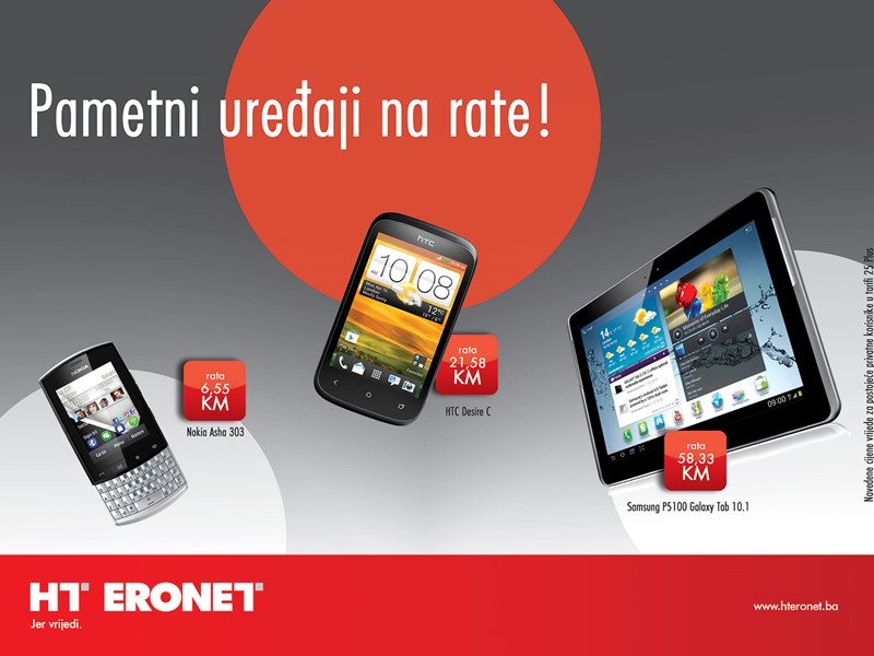 Iz bogate ponude mobitela, laptopa, netbooka i tableta izdvajamo posebno tri uređaja. Postojeći korisnici koji koriste tarifu 25 Plus mogu dobiti mobitel Nokia Asha 303 za 6,55 KM mjesečno, HTC Desire C za 21,58 KM i Samsung P5100 Galaxy Tab 10.1 za 58,33 KM mjesečno u 12 rata.