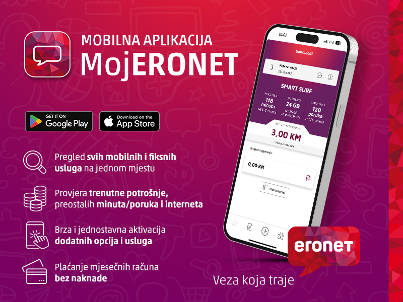 Mobilna aplikacija Moj ERONET za Android i iOS platforme namijenjena je isključivo privatnim korisnicima fiksnih i/ili mobilnih usluga HT Eroneta.