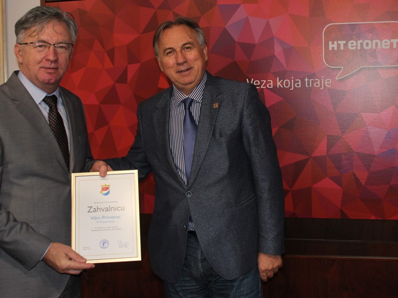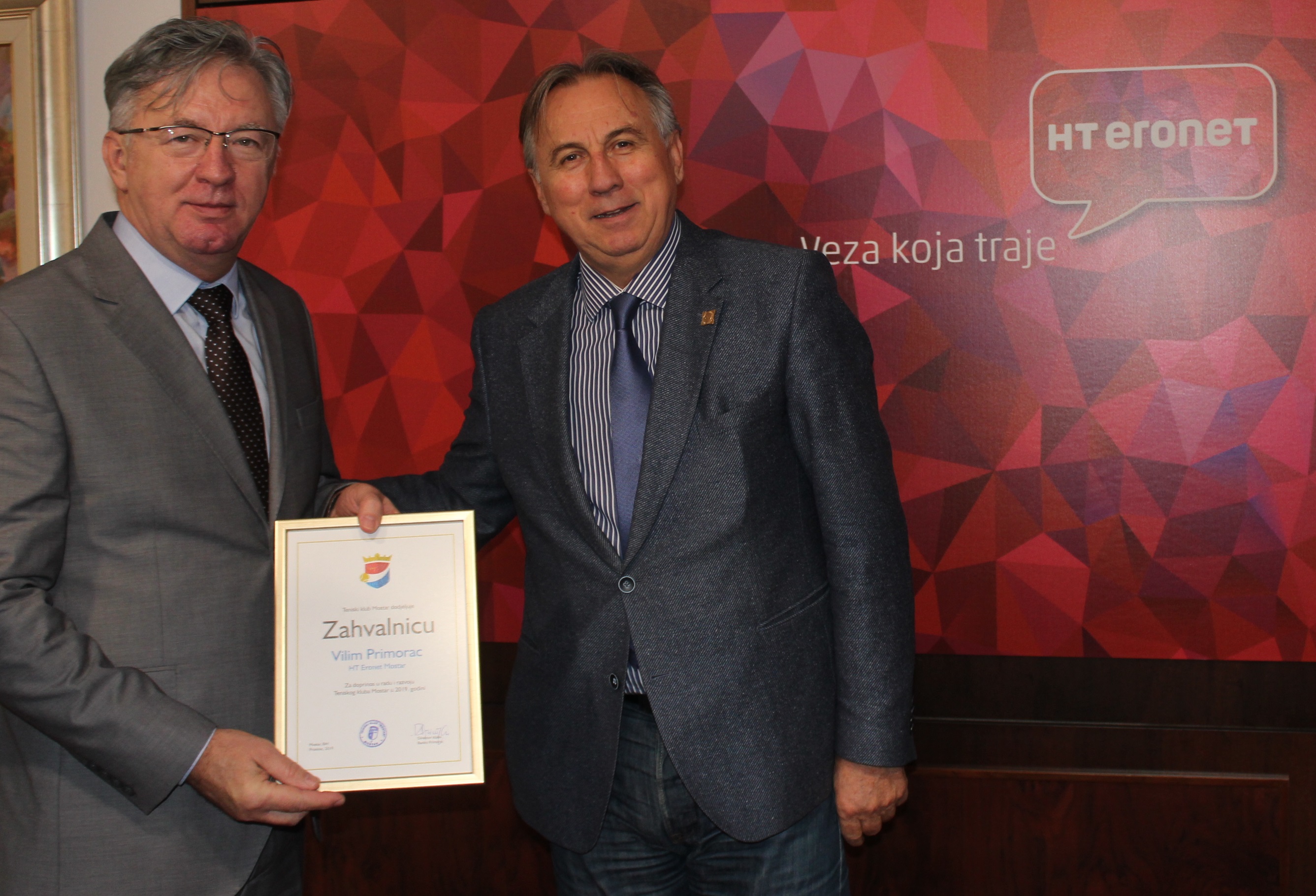Izaslanstvo Tenis kluba Mostar, predvođeno direktorom Rankom Primorcem, danas je posjetilo HT ERONET i tom je prigodom uručena zahvalnica predsjedniku Uprave Vilimu Primorcu za doprinos u radu i razvoju ovoga kluba u 2019.