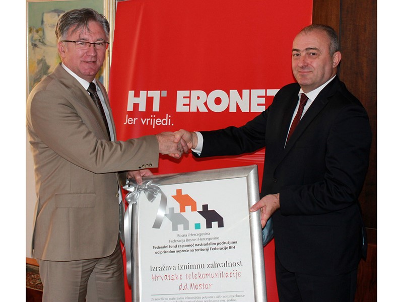 Danas je direktor Federalnog fonda za pomoć nastradalim područjima od prirodne nesreće na teritoriju Federacije BiH, Jasmin Jaganjac posjetio JP HT d.d. Mostar i uručio zahvalnicu predsjedniku Uprave ovoga poduzeća Vilimu Primorcu za 200.000 KM, koje je HT d.d. Mostar izdvojio za pomoć područjima nastradalim u katastrofalnim poplavama u BiH.