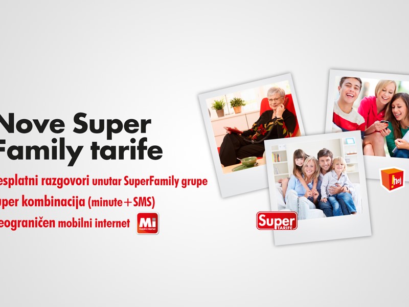 HT Eronet predstavlja novu SuperFamily tarifu koja korisnicima omogućuje kombinaciju minuta, SMS poruka i neograničenog Mobilnog interneta, a sve to uz uključivanje različitih vrsta korisnika u SuperFamily grupu. Ovu uslugu mogu aktivirati kako novi, tako i svi postojeći korisnici.