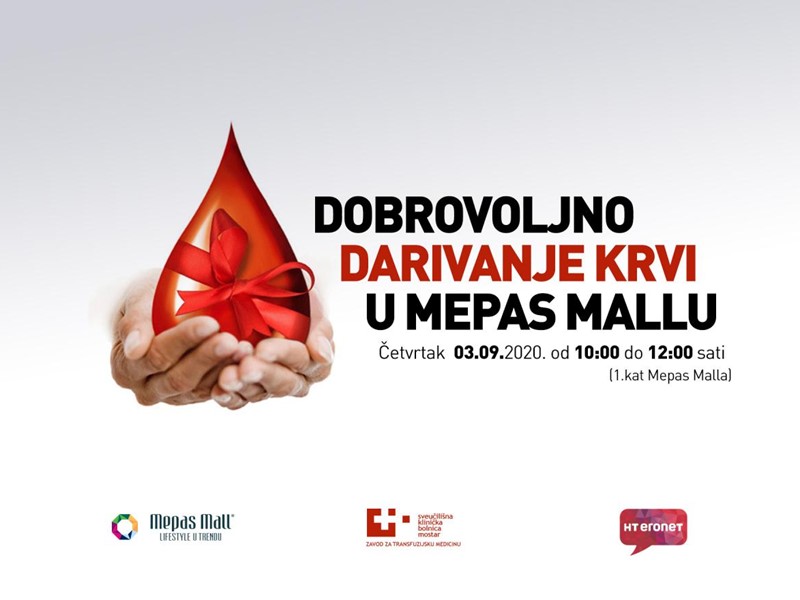 Sutra će (četvrtak, 3. rujna), od 10 do 12 sati, na 1. katu Mepas Malla, u suradnji sa Zavodom za transfuzijsku medicinu SKB Mostar, biti održana dobrovoljna akcija darivanja krvi za djelatnike HT ERONET-a.