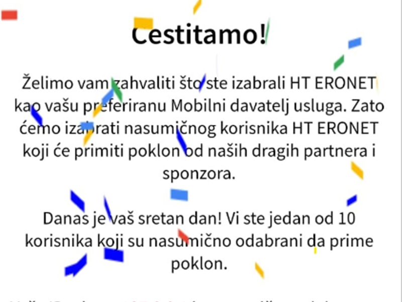 Riječ je o lažnoj nagradnoj igri te upozoravamo korisnike da ne nasjedaju na ovakve ili slične pokušaje prijevare.