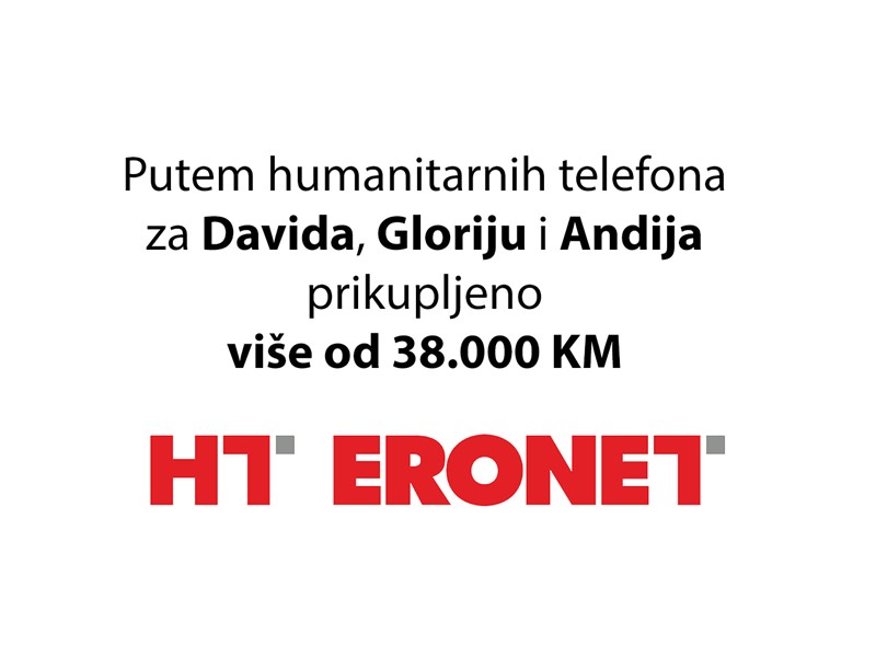 Zahvaljujući dobrim ljudima, a putem otvorenih humanitarnih telefona HT Eroneta, za Davida Tarabu iz Viteza, Gloriju Arlović iz Orašja i Andija Milasa iz Mostara tijekom prošlog mjeseca prikupljeno je čak 38.377 KM, a za razne akcije Udruge „Otvorena mreža“ iz Sarajeva, koja pomaže velikom broju socijalno ugroženih obitelji i bolesnima, prikupljeno je 14.574 KM.
