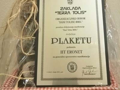 Za generalno sponzorstvo manifestacije HT ERONET-u dodijeljena je prigodna plaketa koju je preuzeo kolega Saša Nedić, voditelj Grupe za prodaju privatnim korisnicima iz HT ERONET-ova centra u Orašju.